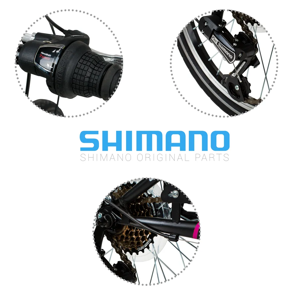Das Kinderfahrrad Atlantis verfügt über einen extrem robusten Hi-Ten Stahlrahmen (Rahmenhöhe: 34 Zentimeter) und einen kindgerechten tiefen Einstieg. Der geschlossene Kettenkasten sorgt auch bei rasanteren Fahrten für ein Höchstmaß an Sicherheit. Eine hochmoderne 18-Gang Shimano-Kettenschaltung, Shimano Umwerfer sowie eine Shimano RevoShift-Drehgriffschaltung sind weitere Vorzüge dieses zuverlässigen und durchdachten Kinderfahrrads. Vorne und hinten besitzt es zudem komfortable V-Bremsen. Damit auch längere Touren in bequemer und ermüdungsfreier Haltung gefahren werden können, wurde Atlantis mit einem optimal geformten City-Lenker ausgestattet.