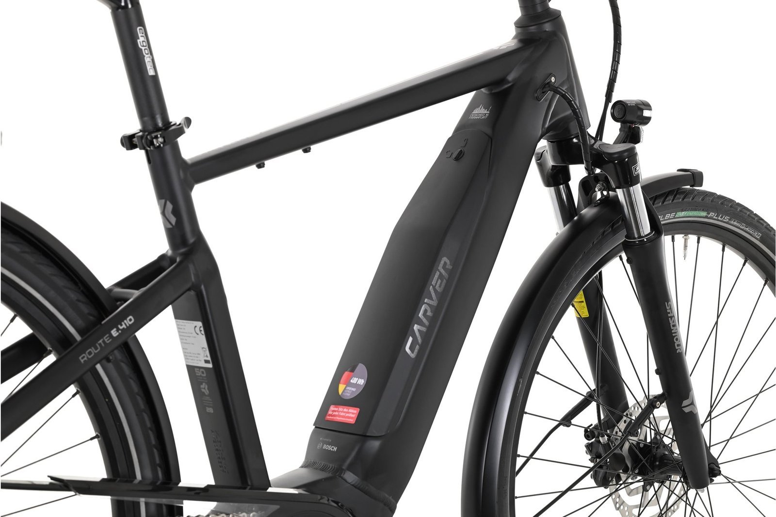 Das fängt bei den 28″ Laufrädern an und endet beim schicken Diamant Rahmen aus Aluminium. Für den nötigen Vortrieb sorgt dabei ein kräftiger Bosch Active Line Plus Mittelmotor mit 50 Nm Drehmoment. Damit der Spaß kein jähes Ende findet, setzt Carver auf einen großzügigen 400 Wh Intube-Akku. Dieser bietet selbst für lange Ausfahrten genug Saft.Das Carver Route E.410 ist ein sehr durchdachtes und sinnig ausgestattetes E-Trekkingbike.