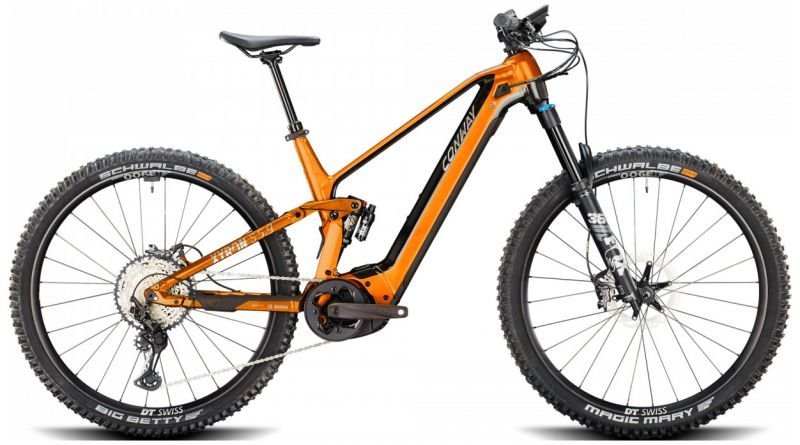 Rahmen: CONWAY Fully Intube Bosch, Alu Rahmenmaterial: Aluminium Laufradgröße: 29″ Farbe: orange / black metallic Gabel: FOX « Performance 36 Float », 150 mm Dämpfer: FOX « Float X » 140 mm Federweg: 150 mm / 140 mm Bremsen: SHIMANO „Deore XT BR-M8120″, 4-Kolben Bremsscheiben: SHIMANO « RT-MT800 », 203 mm Bremshebel: SHIMANO « Deore XT BL-M8100 » Vorbau: ERGOTEC « Bass 45 », 31,8 mm Lenker: ERGOTEC « Low Rizer », Ø 31,8, 780 mm Griffe: SQLAB « 70X » Sattel: FIZIK « Aidon » Sattelstütze: CONTEC « Drop – A – Gogo », 31,6 mmCONTEC « Drop – A – Gogo », 31,6 mm Kurbel: MIRANDA « Epsilon », 165 mm; MIRANDA B 36 Z Tretlager/Innenlager: BOSCH Schaltwerk: SHIMANO « Deore XT RD-M8100 Shadow Plus », 12speed Schalthebel: SHIMANO « Deore XT SL-M8100 » Kassette: SHIMANO « CS-M7100 », 10-51 Z. Kette: SHIMANO « CN-M7100 » Reifen vorne: SCHWALBE « Magic Mary », Soft, 62-622 Reifen hinten: SCHWALBE « Big Betty », Soft, 62-622 Speichen: DT Swiss Felgen: DT SWISS „Spline H1900″ Display: BOSCH, « Kiox 300 », 4-Stufen, Remote Control, Schiebehilfe Akku: BOSCH « Powertube 750 », Lithium-Ionen mit BMS, 750 Wh Ladegerät: Bosch 4 Ah Motor: BOSCH Mittelmotor Gen.4 « Performance CX », 36 V, 250 W Pedale: nicht im Lieferumfang enthalten Zulässiges Gesamtgewicht: 130 kg (Körpergewicht + Fahrrad + Ausrüstung) Gewicht Komplettrad: 26,9 kg