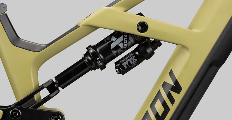 Der flügelähnliche Überwurf, welcher Ober und Unterrohr verbindet, macht nicht nur optisch was her, sondern bietet auch in technischer Hinsicht ein absolutes Highlight. Sowohl der Carbon-Hauptrahmen als auch die Trunnion-Dämpferaufnahme bewirken eine Menge Steifigkeit und Stabilität. Wie auch beim RENDER bietet die untere Dämpferaufnahme gleichzeitig einen Teil der Wippe, welche dem Rahmen eine einzigartige Kinematik und besonders hohe Stabilität des Hinterbaus verleiht. Der 750Wh große Akku wird durch eine Patrone in das Unterrohr integriert, die für geräuscharmes Fahren und einen wackelfreien Sitz sorgt. Durch eine gummierte Abdeckung, welche das Unterrohr abschließt, lässt sich der Akku problemlos und schnell entnehmen. Mittels der am Sitzrohr befindlichen Ladebuchse lässt sich der Akku ohne Entnahme laden. Das Schaltwerk wird am neuen, herstellerübergreifend genormten UDH hanger montiert, der Speedsensor ist elegant in der Bremsscheibe und Kettenstrebe integriert, sodass der klassische Speichenmagnet der Vergangenheit angehört.